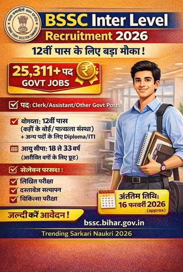 बिहार कर्मचारी चयन आयोग (BSSC) ने Inter Level Recruitment 2026 के अंतर्गत कुल 25,311 पदों पर भर्ती प्रक्रिया शुरू कर दी है। यह भर्ती 12वीं पास अभ्यर्थियों के लिए सुनहरा अवसर है, जिसके माध्यम से विभिन्न सरकारी विभागों में स्थायी नियुक्ति प्राप्त की जा सकती है। आवेदन प्रक्रिया फिलहाल चालू है और अंतिम तिथि नज़दीक है, इसलिए इच्छुक उम्मीदवार बिना देरी किए जल्द से जल्द आवेदन करें।