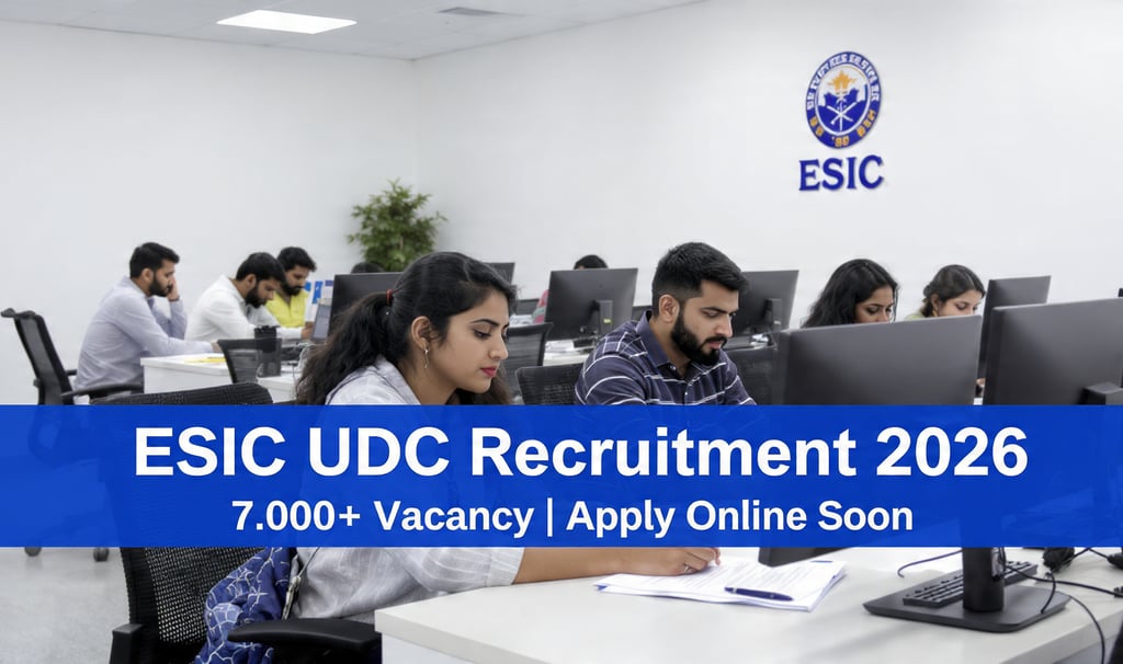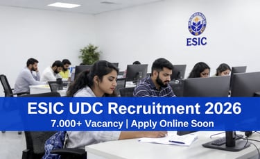 Employees' State Insurance Corporation (ESIC) dwara UDC (Upper Division Clerk) Recruitment 2026 ka notification jaldi hi jari kiya ja sakta hai. Is bharti ke tahat lagbhag 7000+ vacancies expected hain, jo graduate candidates ke liye ek shandar central government job opportunity hai. Selected candidates ko тВ╣25,500 тАУ тВ╣81,100 (Pay Level-4) ke saath DA, HRA aur anya allowances milenge. Selection process me Preliminary Exam, Main Exam aur Skill Test shamil hoga. Jo candidates government clerk job ki tayari kar rahe hain, unke liye yeh ek badi opportunity ho sakti hai. Official notification release hote hi eligibility, age limit, exam pattern aur online apply link ki complete details check kar sakte hain. Latest update ke liye regular visit karte rahein.