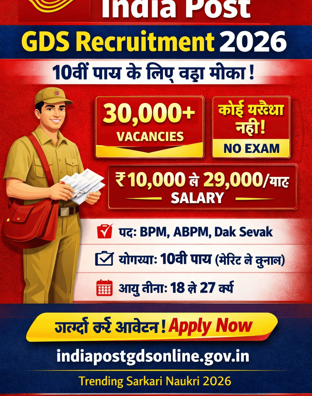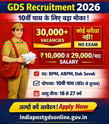 भारतीय डाक विभाग (India Post) ने Gramin Dak Sevak (GDS) Recruitment 2026 के तहत 30,000 से अधिक पदों पर बड़ी भर्ती की घोषणा की है। यह अवसर विशेष रूप से 10वीं पास अभ्यर्थियों के लिए है, जिसमें किसी भी प्रकार की लिखित परीक्षा आयोजित नहीं की जाएगी। उम्मीदवारों का चयन पूरी तरह से 10वीं कक्षा में प्राप्त अंकों की मेरिट लिस्ट के आधार पर किया जाएगा, जिसके कारण यह भर्ती वर्तमान समय की सबसे चर्चित सरकारी नौकरियों में शामिल हो गई है। इस भर्ती प्रक्रिया के अंतर्गत Branch Postmaster (BPM), Assistant Branch Postmaster (ABPM) एवं Dak Sevak जैसे पदों पर नियुक्तियां की जाएंगी। योग्य और इच्छुक अभ्यर्थी आधिकारिक पोर्टल के माध्यम से ऑनलाइन आवेदन कर सकते हैं।
