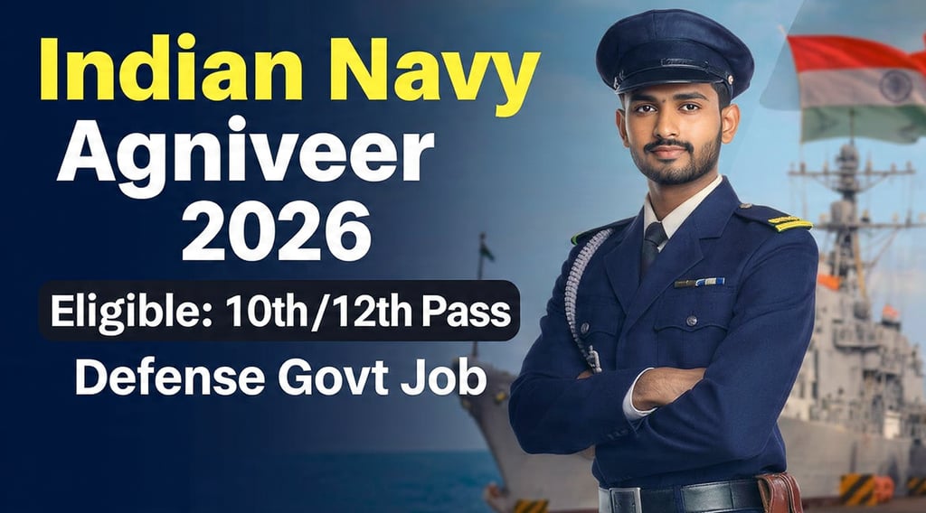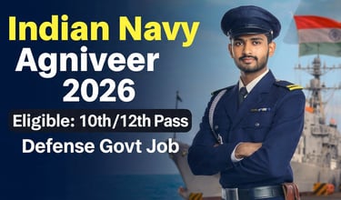 🚨 Breaking News भारतीय नौसेना (Indian Navy) ने Agniveer (SSR एवं MR) Recruitment 2026 का आधिकारिक नोटिफिकेशन जारी कर दिया है। यह भर्ती युवाओं के बीच सबसे तेजी से ट्रेंड करने वाली डिफेंस सरकारी नौकरियों में शामिल हो गई है। योजना के तहत चयनित उम्मीदवारों को भारतीय नौसेना में 4 साल की सेवा का अवसर मिलेगा, साथ ही आकर्षक वेतन और सरकारी सुविधाएं भी दी जाएंगी।