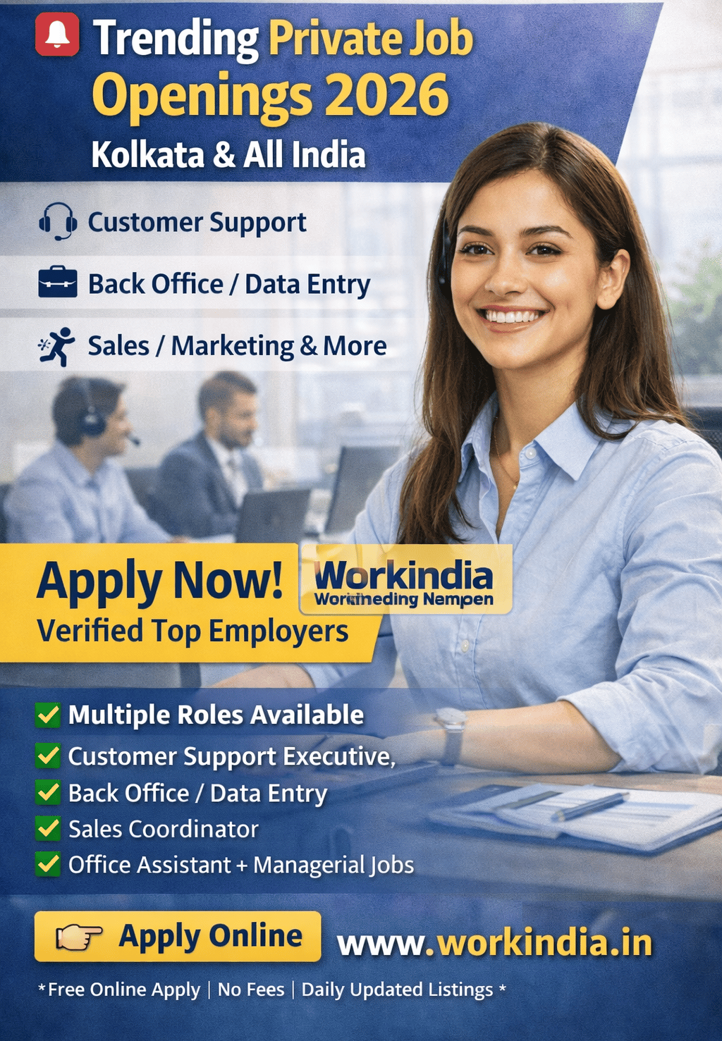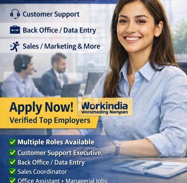 WorkIndia पर 300+ latest private job vacancies उपलब्ध हैं जहां आप Customer Support, Data Entry, Back Office, Sales Coordinator, Office Assistant, Executive Assistant, Peon, Facility Manager जैसे roles के लिए apply कर सकते हैं। यह jobs freshers और experienced दोनों के लिए होते हैं और आपको direct employers ke listings milti hain jaha se online apply kar sakte ho.