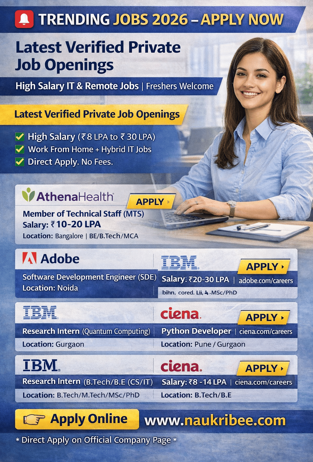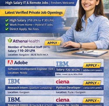 नवीनतम private job openings 2026 में Tech, Software, Remote & Hybrid roles शामिल हैं, जिनमें आप direct company career pages से apply कर सकते हैं। ये jobs freshers और experienced दोनों के लिए उपयुक्त हैं और बड़ी tech कंपनियों जैसे AthenaHealth, Adobe, IBM, Ciena आदि में उपलब्ध हैं।