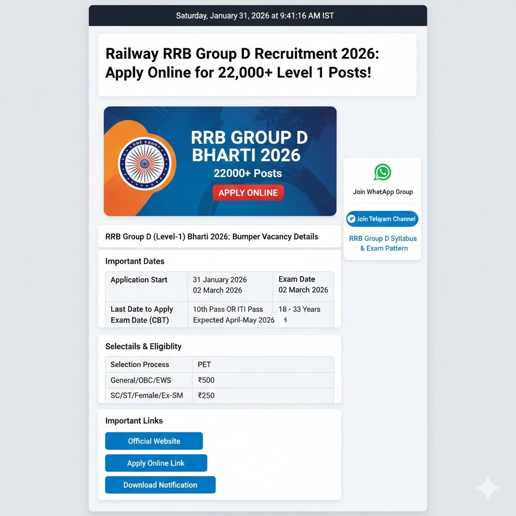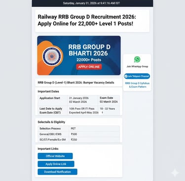 Railway RRB Group D Recruitment 2026: Apply Online for 22,000+ Level 1 Posts!
