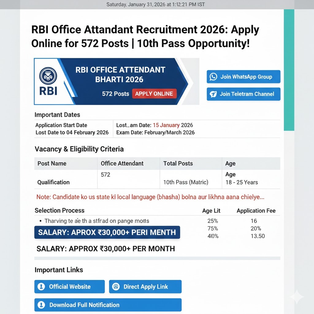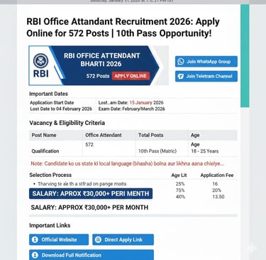 Reserve Bank of India (RBI) invites applications for 572 Office Attendant posts. Eligibility: 10th Pass. Check age limit, selection process, and last date to apply (4th February 2026) here.