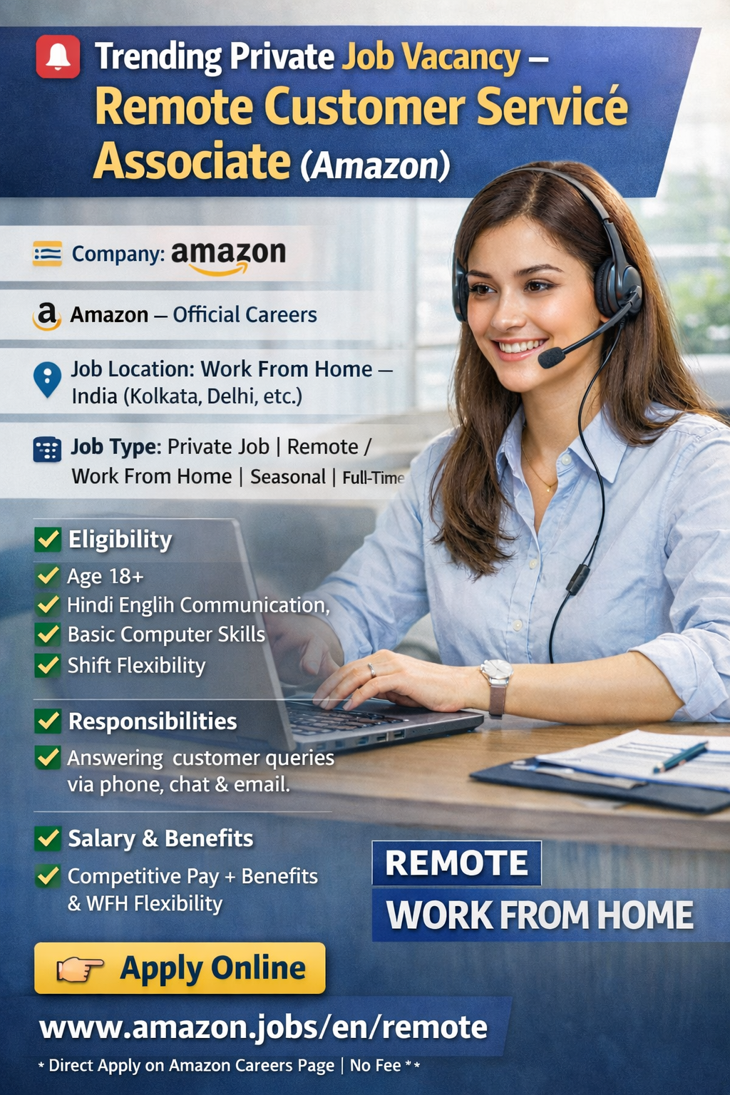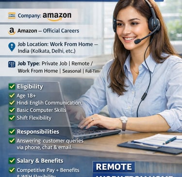 Amazon India ने Virtual Customer Service Associate के पदों के लिए भर्ती शुरू कर दी है। यह एक work-from-home remote job है जिसमें उम्मीदवार customers के queries (phone, chat, email) को solve करेंगे। इस रोल में आप Amazon की global support टीम का हिस्सा बनेंगे और ग्राहकों को श्रेष्ठ सहायता प्रदान करेंगे। आवेदन के लिए कोई fake link नहीं — केवल Amazon official careers page पर ही apply करें।