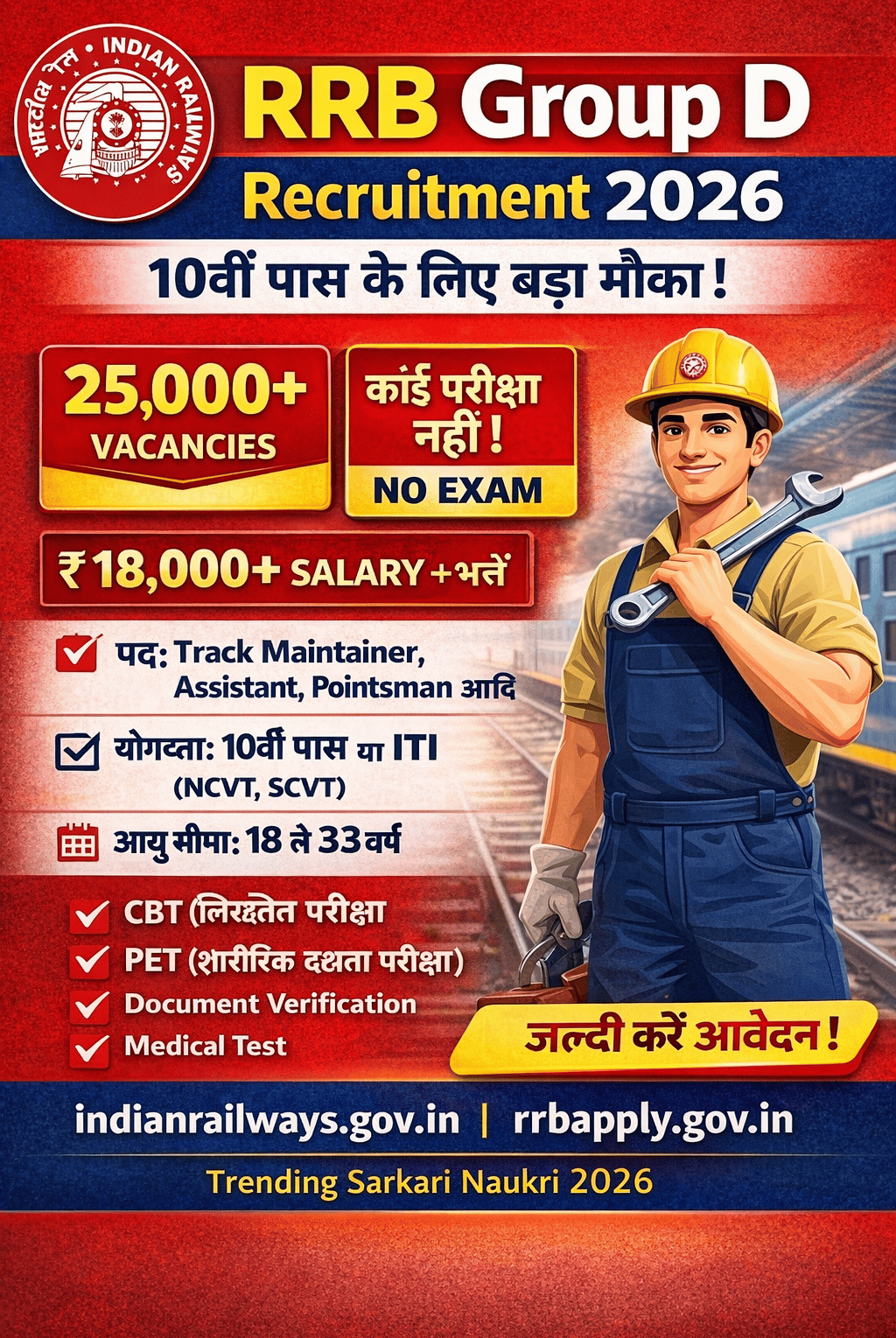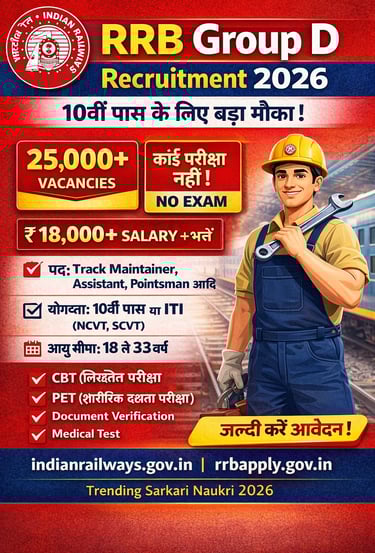 रेलवे भर्ती बोर्ड (RRB) ने Group D (Level-1) Recruitment 2026 के अंतर्गत लगभग 25,000 से अधिक पदों पर भर्ती प्रक्रिया शुरू कर दी है। यह भर्ती 10वीं पास एवं ITI योग्यताधारी उम्मीदवारों के लिए आयोजित की जा रही है, जिसमें पूरे देश के विभिन्न रेलवे ज़ोन में पदों को भरा जाएगा। रेलवे में नौकरी को हमेशा से ही सबसे लोकप्रिय और उच्च मांग वाली सरकारी नौकरियों में गिना जाता है, इसी वजह से RRB Group D भर्ती 2026 भी उम्मीदवारों के बीच तेजी से ट्रेंड कर रही है।.