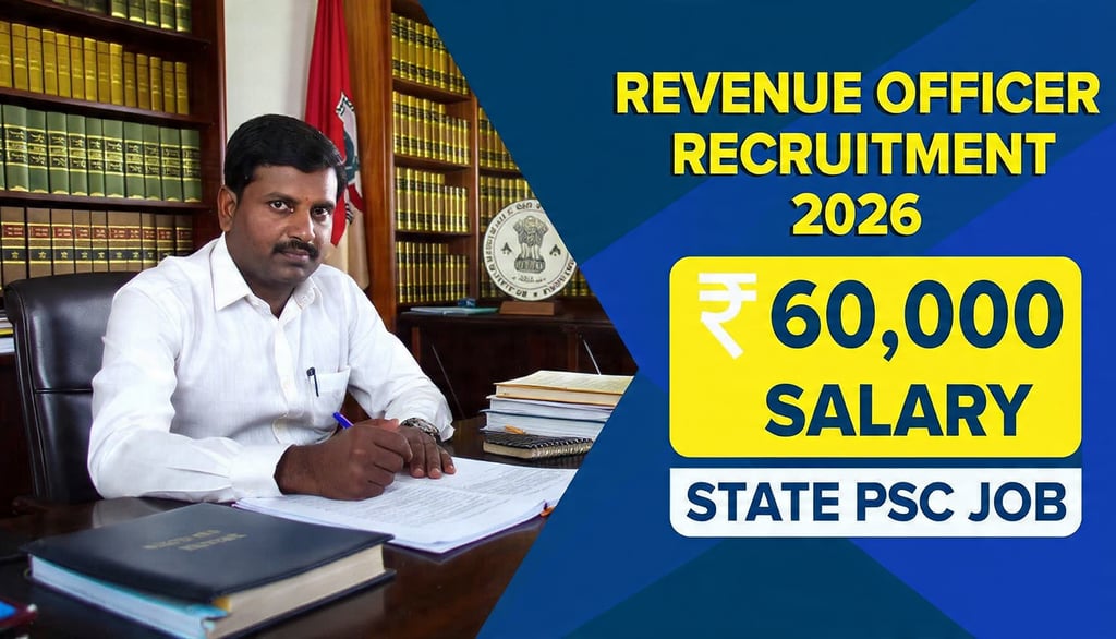 Revenue Officer Recruitment 2026 ke liye state-wise Public Service Commission (PSC) ke through bumper vacancy expected hai. Graduation pass candidates Tehsildar, Naib Tehsildar aur Revenue Inspector posts ke liye online apply kar sakte hain. Is update me aapko milega complete eligibility criteria, age limit, salary ₹35,000 se ₹60,000 per month, selection process (Prelims, Mains, Interview) aur official application process ki full details. Latest Revenue Department Bharti 2026 ki sabhi jankari yahan check karein. 🚀